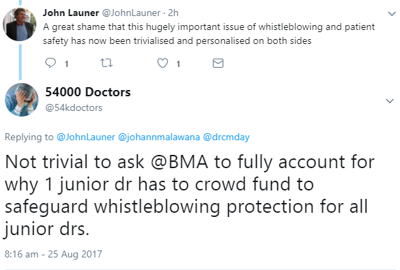 I don't understand Johann's surprise at being asked to clarify his position on support for my case. When he was JDC Chair he offered no support to a case that exposed as legally flawed and ended up solving a Government made gap in whistleblowing law affecting all junior doctors. It is obvious how this case could have assisted in the junior doctor dispute. During the dispute I wrote to Johann on two occasions.