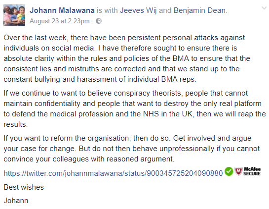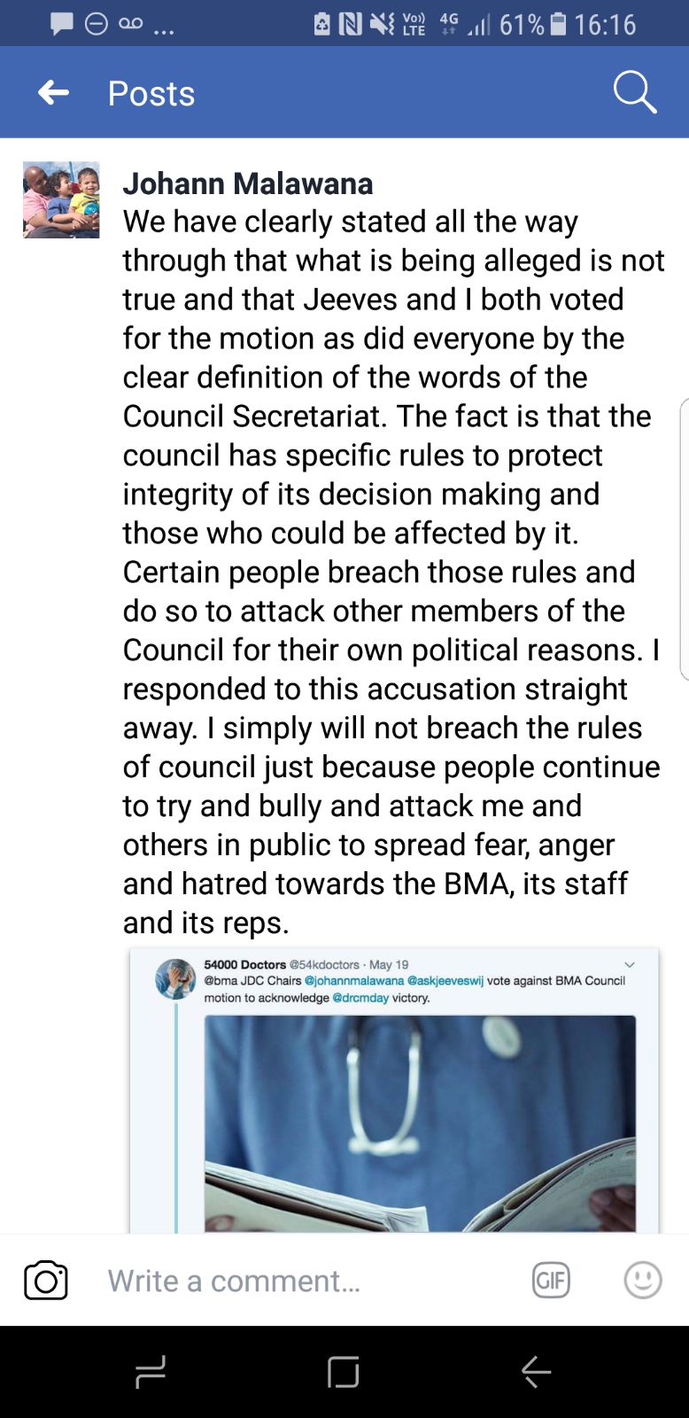 On 23 August, instead of Johann and Jeeves responding the simple question of how they voted on a vital issue at a BMA Council meeting, the BMA Secretariat produced some text which Johann distributed on social media. It contained statements that were not true about my case and campaign.