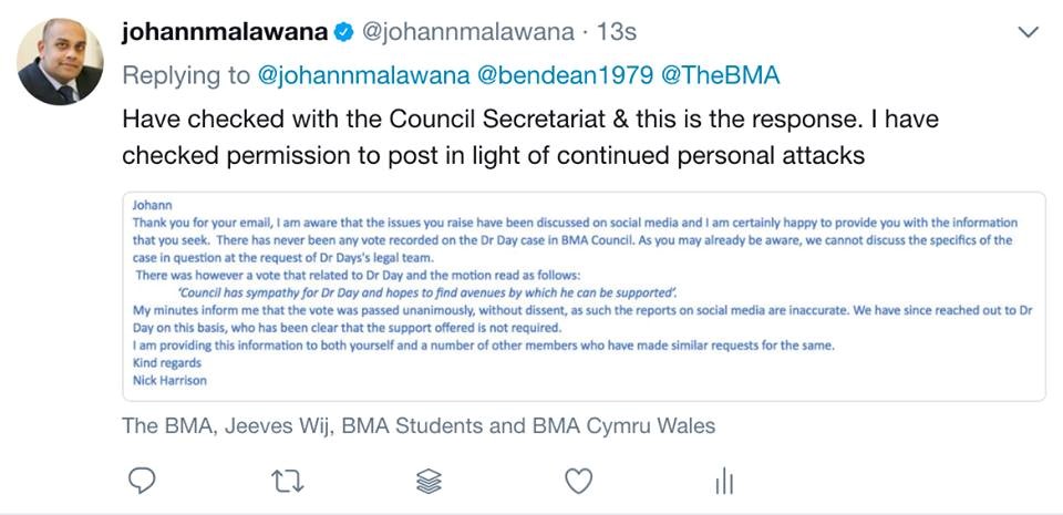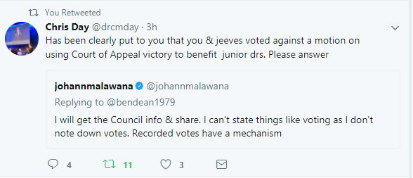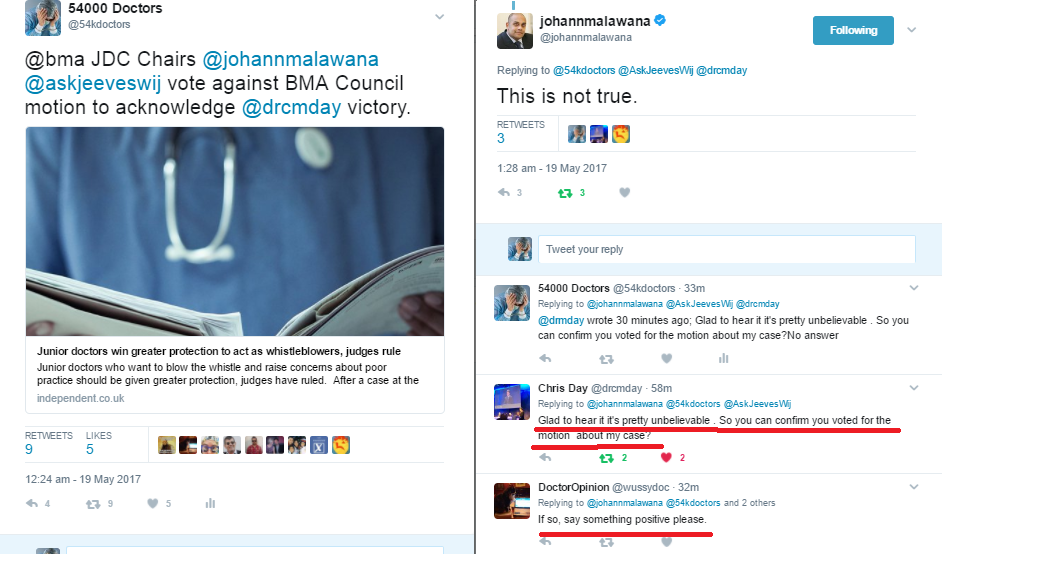 On 19 May, I asked the current and former JDC Chairs, Jeeves Wij and Johann Malawana on Twitter whether or not they voted for a BMA Council motion to support my case. They failed to respond to this question. Johann Malawana had previously confirmed on Twitter to the 54000 doctor campaign that it was not true the suggestion that he voted against the motion. I took that to mean that Johann was likely to have abstained. Jeeves did not respond at all.