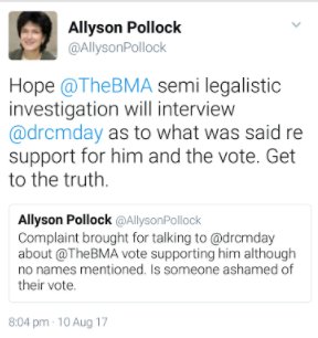 On 10 August, I was made aware of the following Tweets from Professor Allyson Pollock who is widely respected and a highly esteemed member of BMA Council.