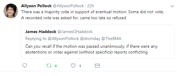 The first I heard about this apparently unanimous motion was on Twitter on 23 August, some 3 months after the vote. This came about following allegations being made by Professor Alyson Pollock on Twitter about the voting in the meeting and also the fact she was being investigated for making this information public.