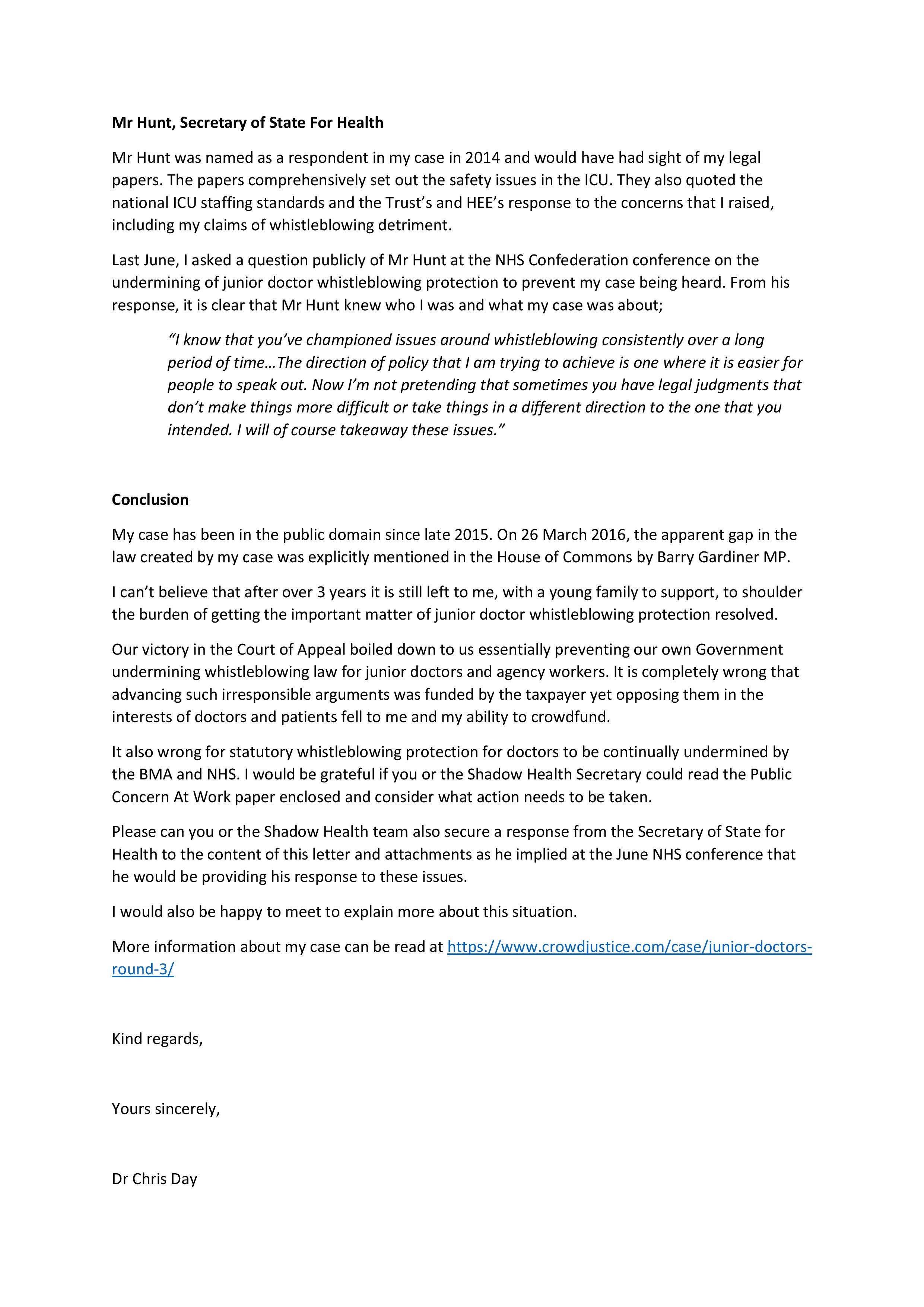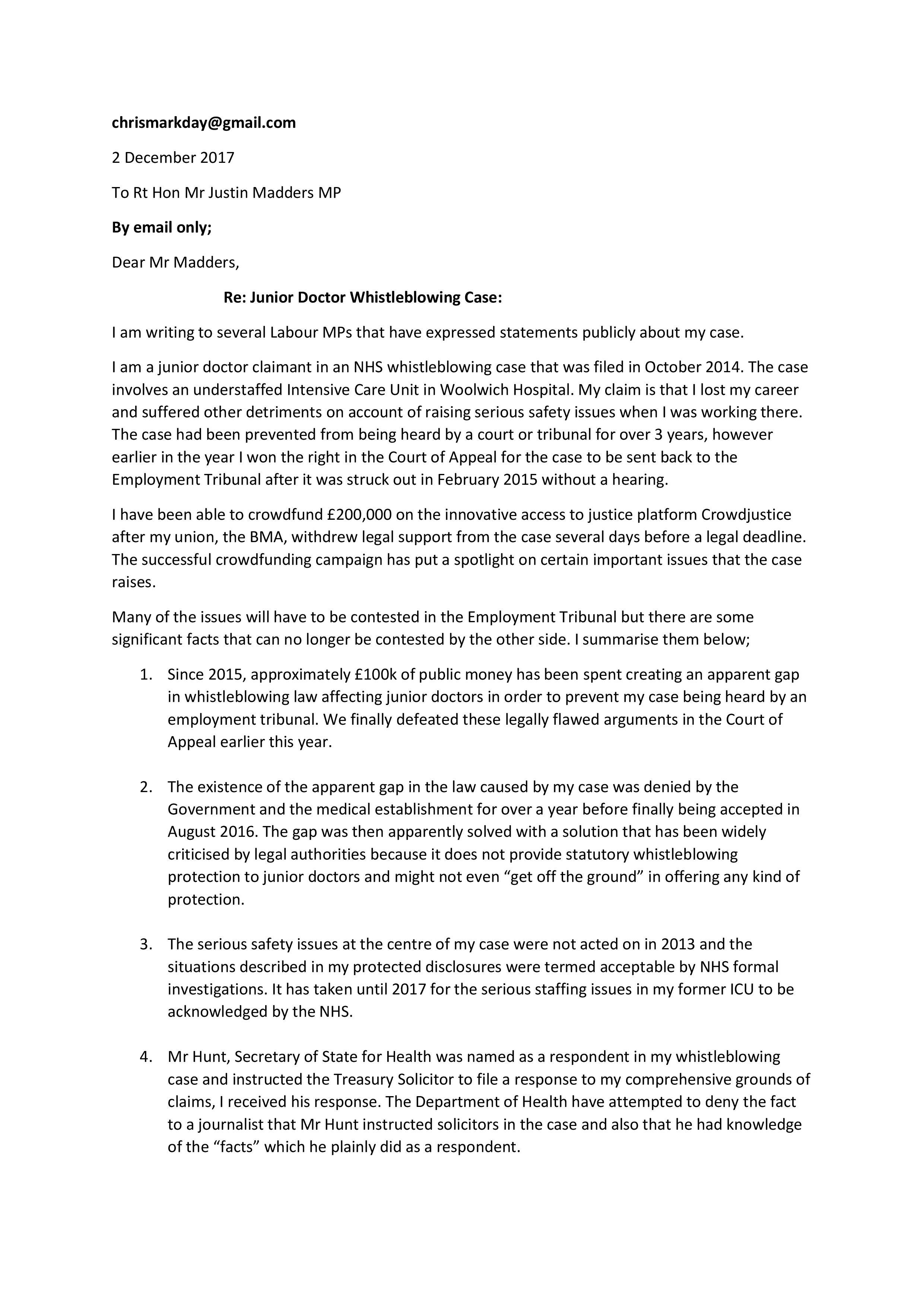 Dr Day has written to Shadow Health Minister Justin Madders MP following his comment in this Daily Mirror article about his case: